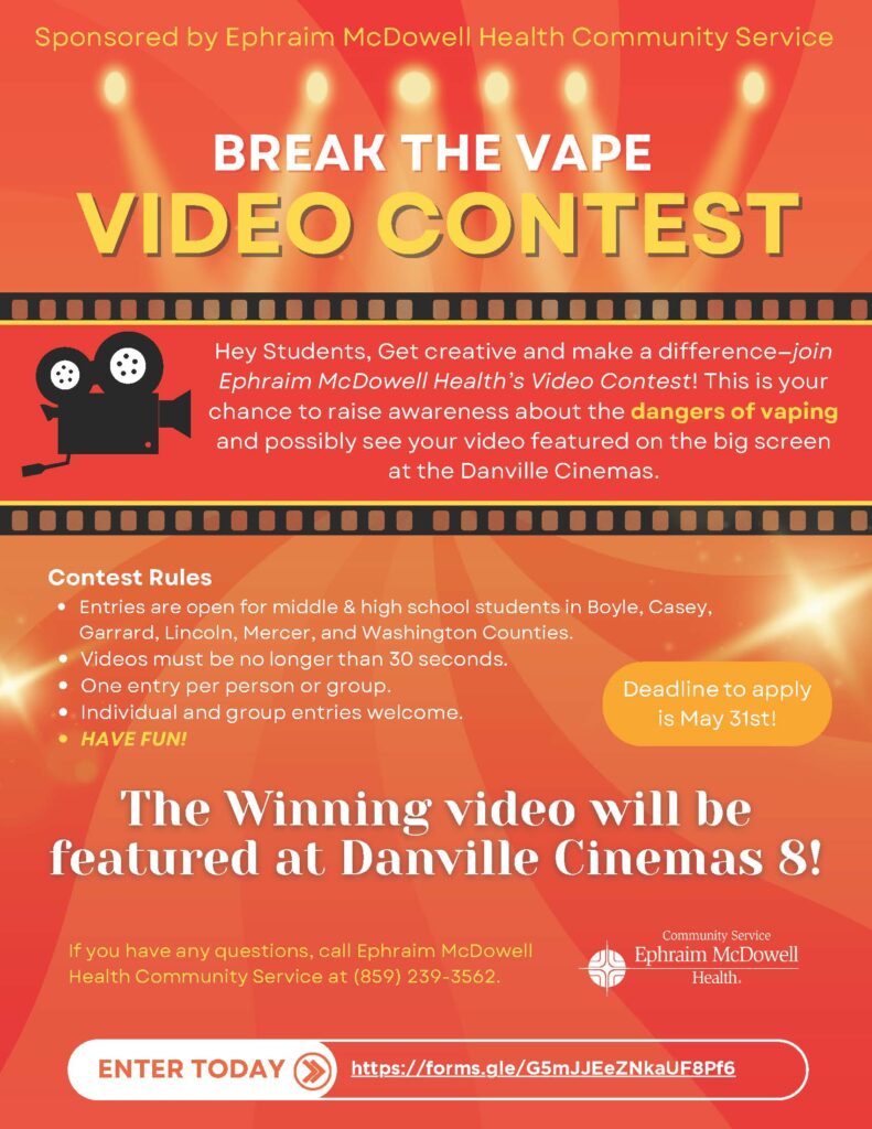 Ephraim McDowell Health (EMH) is proud to announce the launch of its “Break the Vape” Public Service Announcement (PSA) Contest, a youth prevention initiative designed to empower students to speak out about the dangers of vaping.