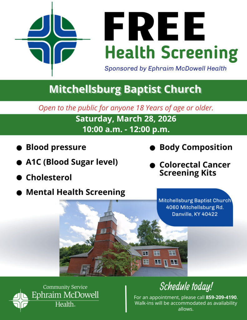 Ephraim McDowell Health is sponsoring a free health screening at Mitchellsburg Baptist Church on Saturday, March 28. The screenings will be offered from 10 a.m. to noon.