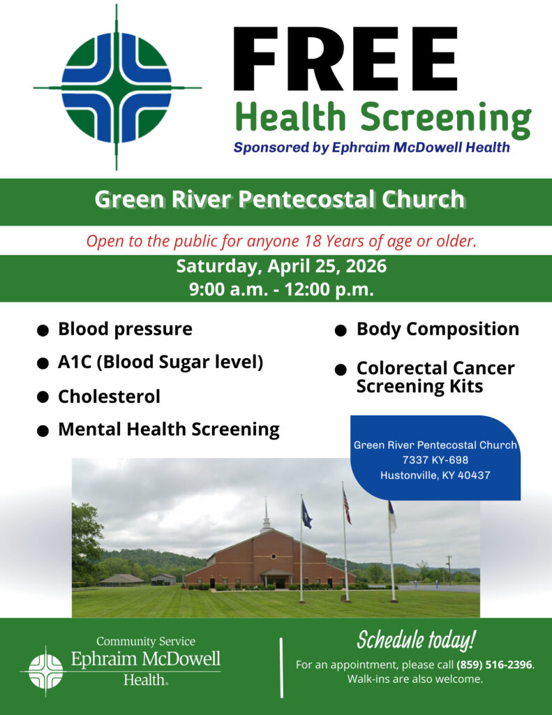 Ephraim McDowell Health is sponsoring a free health screening at Green River Pentecostal Church in Hustonville on Saturday, April 25. The screenings will be offered from 9 a.m. to noon.